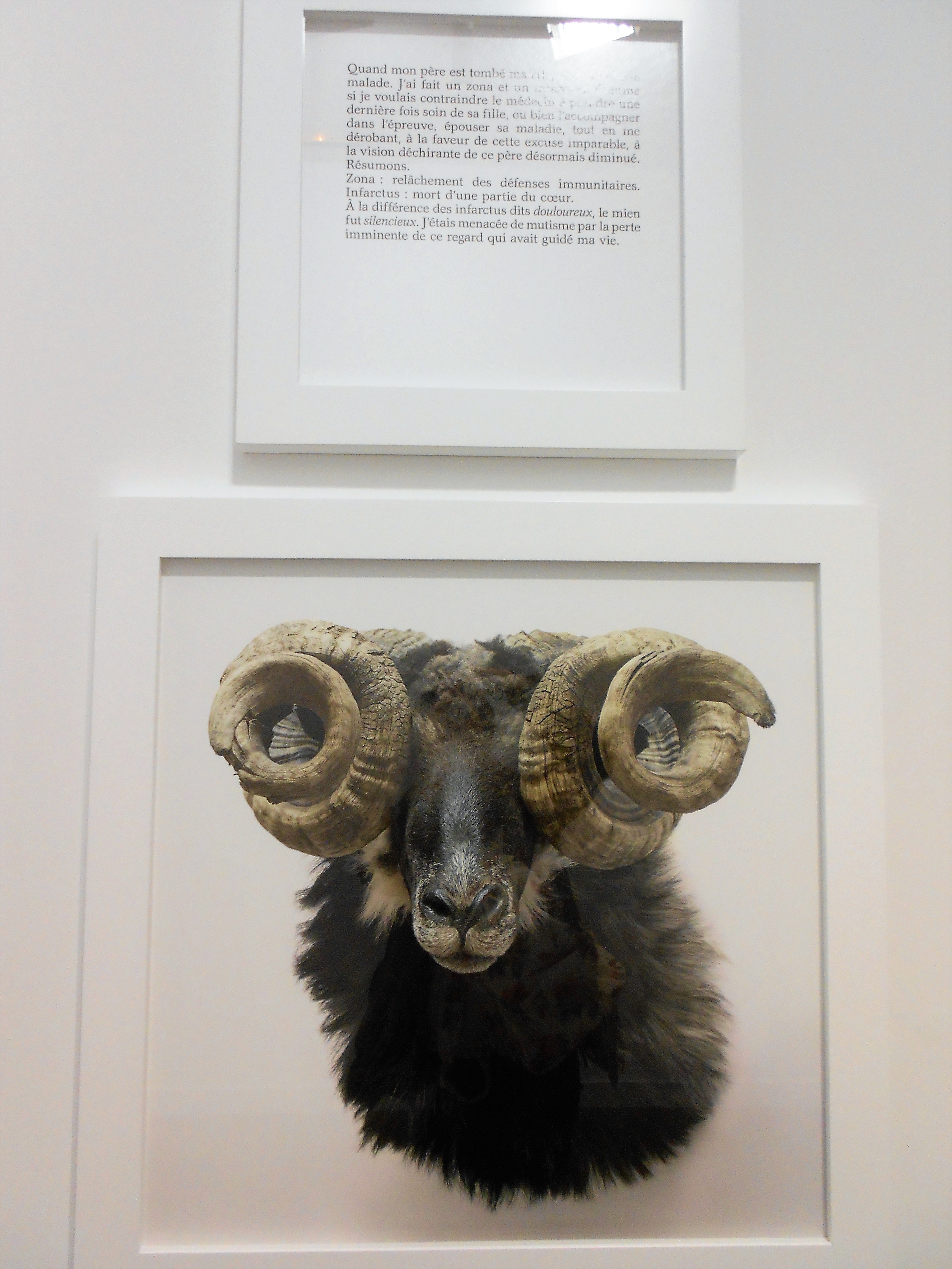 Echange de regards: les yeux du bélier de Sophie Calle sont absents. Son regard nous échappe. Qu’importe! Les yeux de l’oeuvre située en face, par Serena Carone répondent présent!