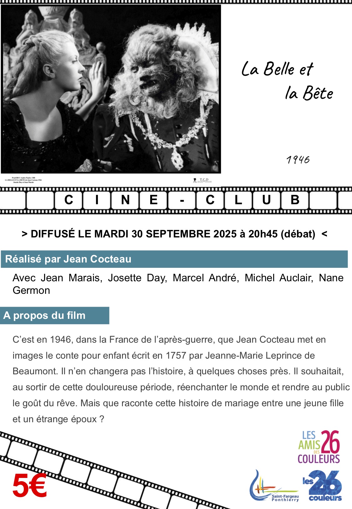 Cine club La belle et la bête 24 septembre 2025 Hélène Couderc Ciné-club, Notre actualité Share C’est la rentrée du ciné club. Mardi 30 septembre venez nombreux revoir ce film culte .