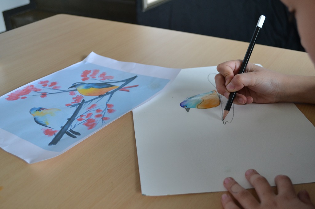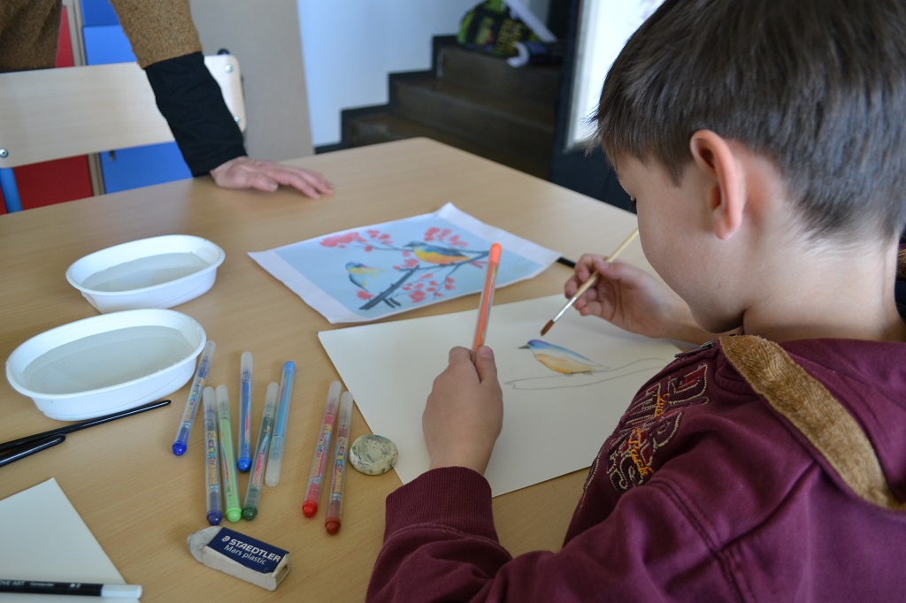 L’animatrice nous donne pour modèle une photo au thème printanier : fleurs de cerisier aux couleurs pastel dont le fond joue avec le flou, idéal pour une aquarelle. Pour mon fils, c’est un dessin représentant des oiseaux.